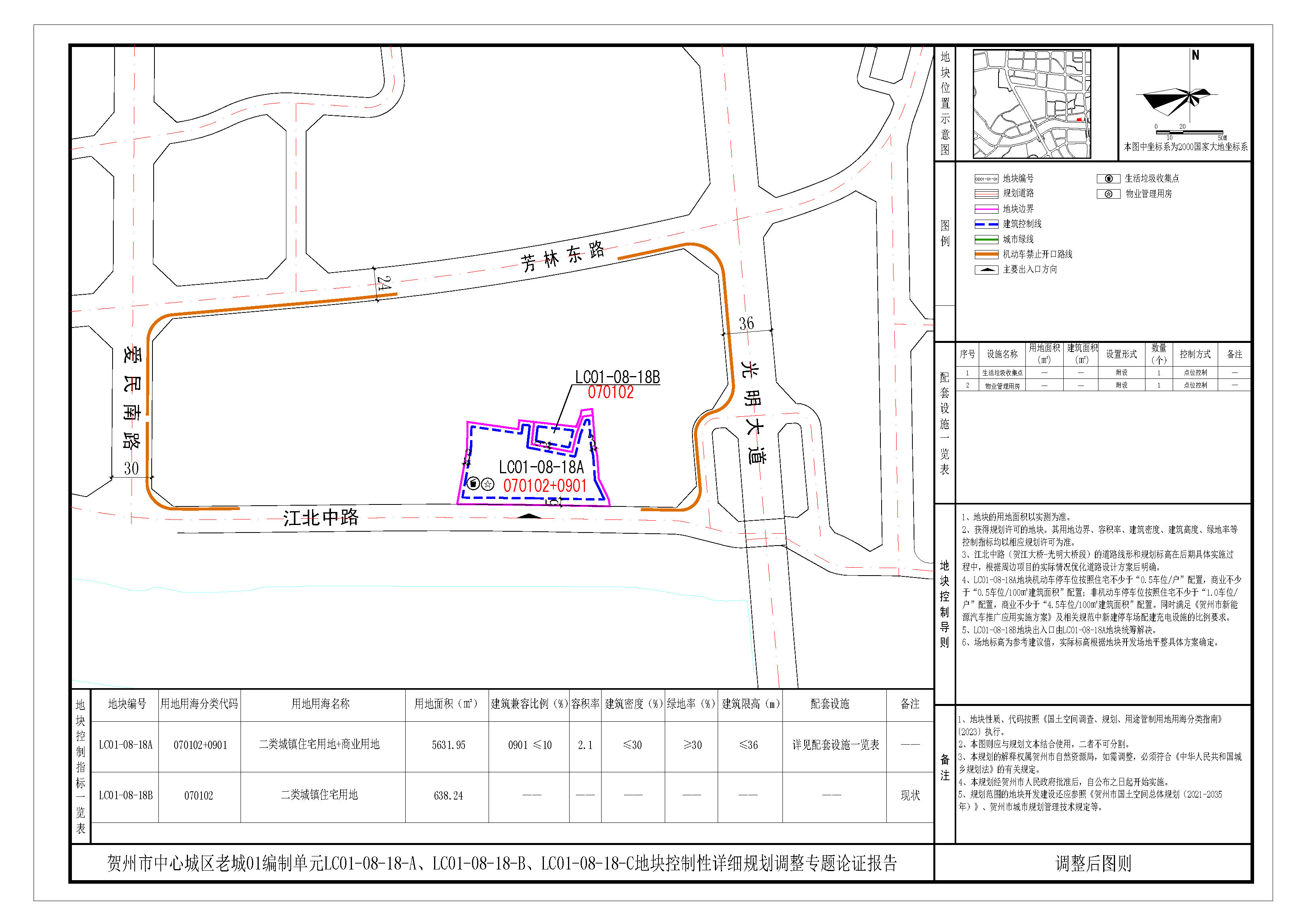 调整内容:将LC01-08-18A、LC01-08-18B、LC01-08-18C调整为LC01-08-18A和LC01-08-18B两个地块,调整后LC01-08-18A地块的用地性质为二类城镇住宅用地+商业用地,商业建筑比例不高于10%,指标按照容积率不高于2.1,建筑密度不高于30%,绿地率不低于30%,建筑限高36米进行控制;LC01-08-18B地块的规用地性质及划指标按现状保留。