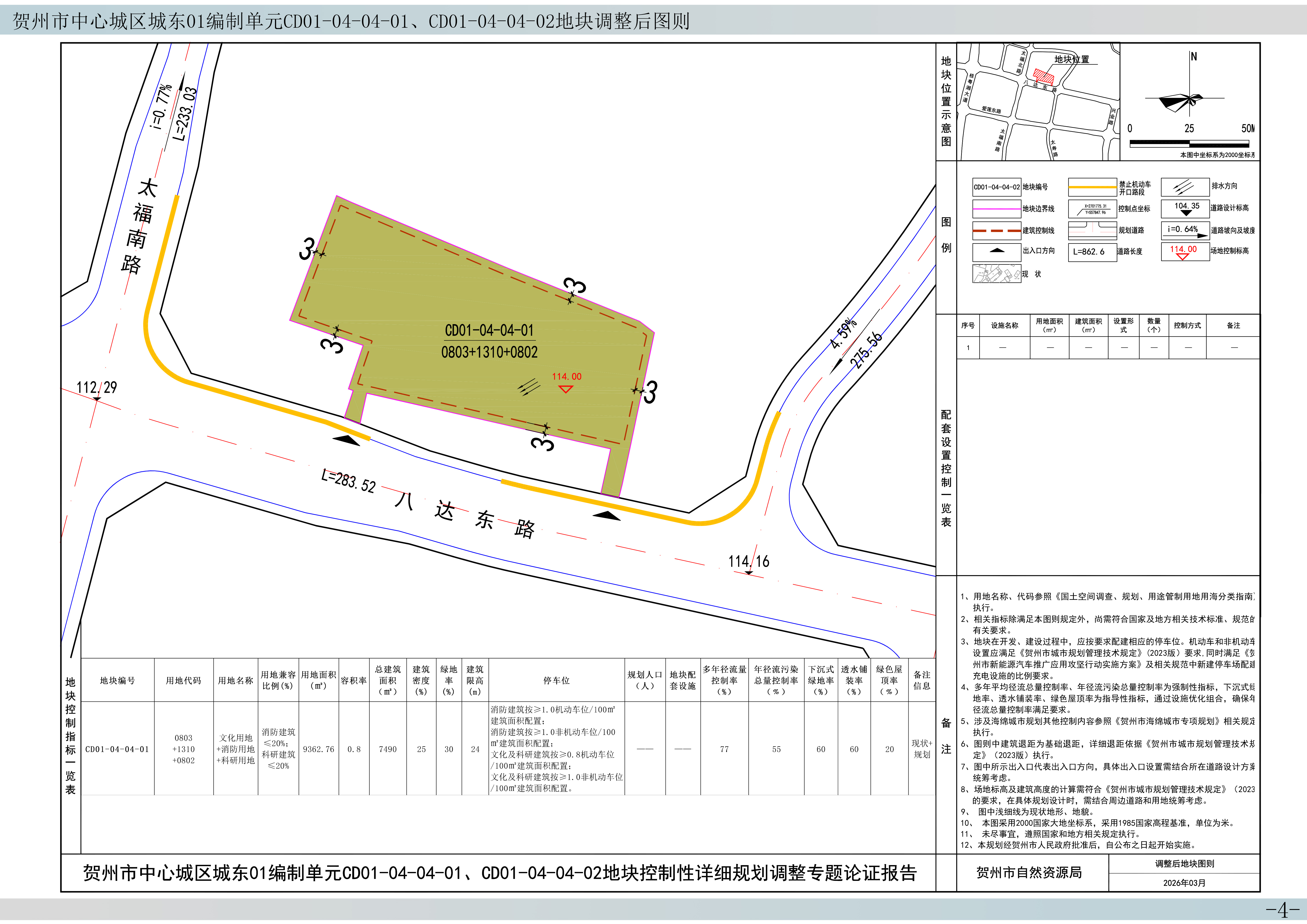 调整内容:一是将CD01-04-04-01(面积约6.2亩)和CD01-04-04-02(面积约7.8亩)两个地块合并为CD01-04-04-01一个地块(面积约14亩);二是将合并后的CD01-04-04-01地块用地性质统一调整为文化用地+消防用地+科研用地,其中消防建筑兼容比例不高于20%,科研建筑兼容比例不高于20%,指标按容积率不大于0.8,建筑密度不大于25%,绿地率不低于35%,建筑限高24米进行控制;三是优化停车位配建要求。