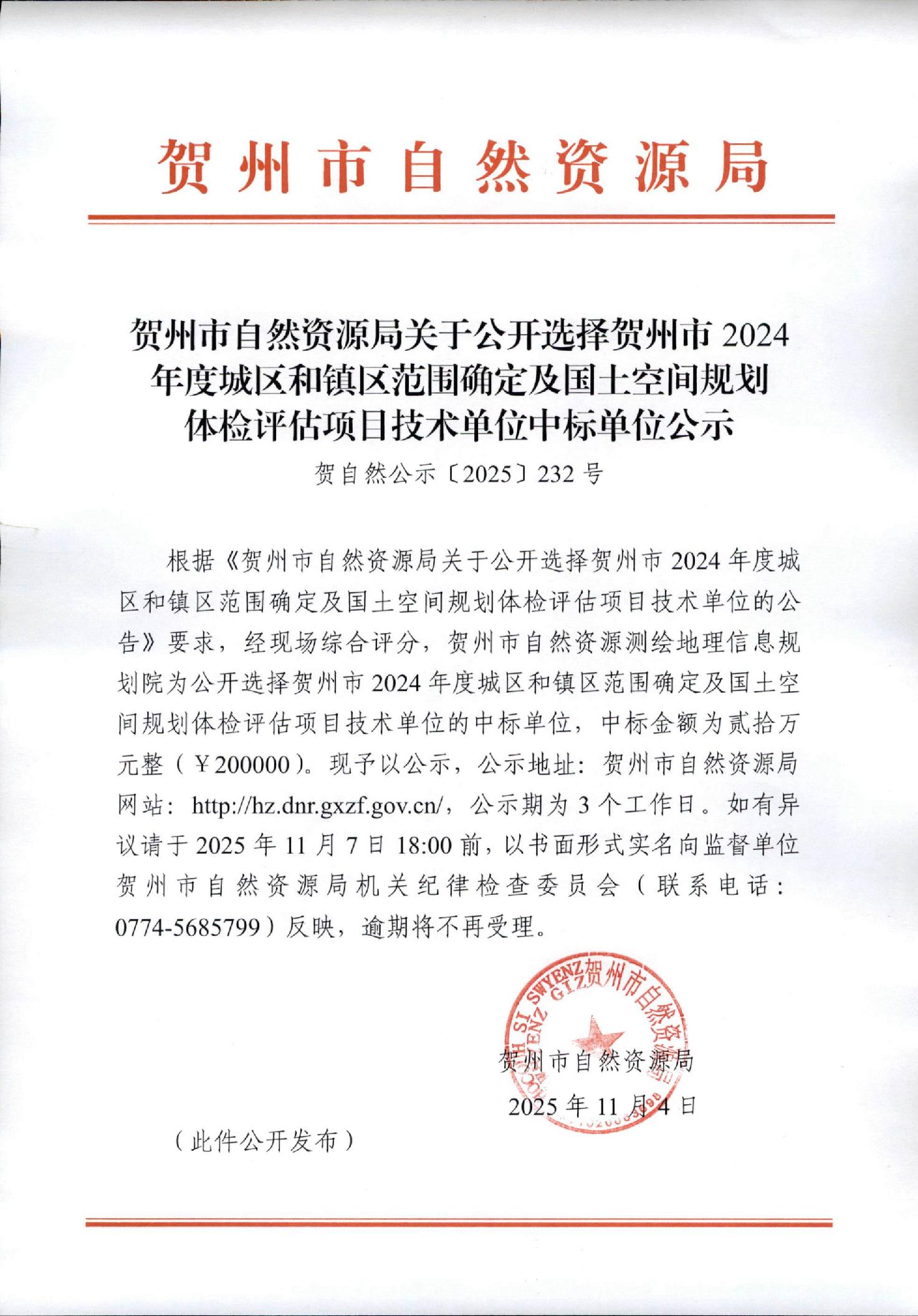 根据《贺州市自然资源局关于公开选择贺州市2024年度城区和镇区范围确定及国土空间规划体检评估项目技术单位的公告》要求,经现场综合评分,贺州市自然资源测绘地理信息规划院为公开选择贺州市2024年度城区和镇区范围确定及国土空间规划体检评估项目技术单位的中标单位,中标金额为贰拾万元整(¥200000)。现予以公示,公示地址:贺州市自然资源局网站:http://hz.dnr.gxzf.gov.cn/,公示期为3个工作日。如有异议请于2025年11月7日18:00前,以书面形式实名向监督单位贺州市自然资源局机关纪律检查委员会(联系电话:0774-5685799)反映,逾期将不再受理。